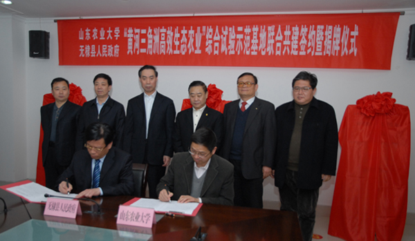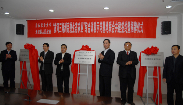 3月15日,bat365在线平台登录与无棣县人民政府联合共建“黄河三角洲高效生态农业”综合试验示范基地签约暨揭牌仪式在无棣县举行。山东农大校长温孚江、副校长张宪省,学校科技处处长米庆华,滨州市人大常委会常务副主任曹兴宽、副市长李维东,无棣县县委书记李恩波共同为基地揭牌。张宪省与无棣县县长丁海堂签署合作协议。