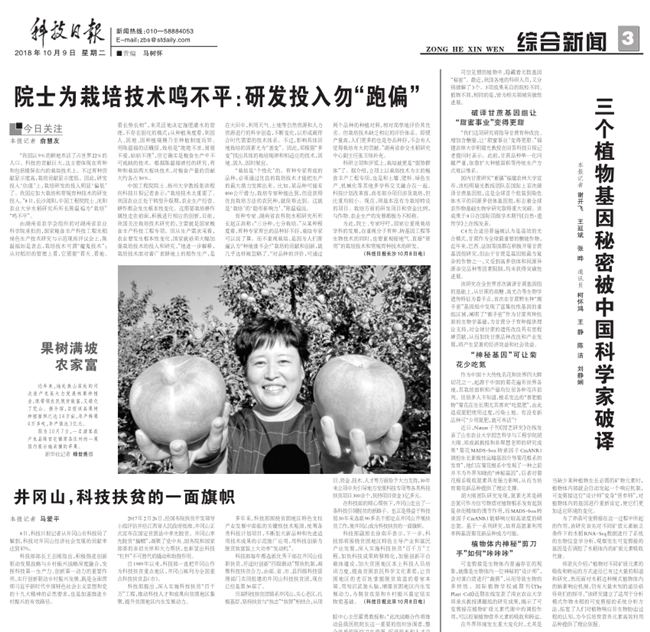 10月9日,科技日报刊发题为《三个植物基因秘密被中国科学家破译》文章,报道国内植物基因研究领域最新科研成果。365官网园艺学院胡大刚团队科研成果位列其中。