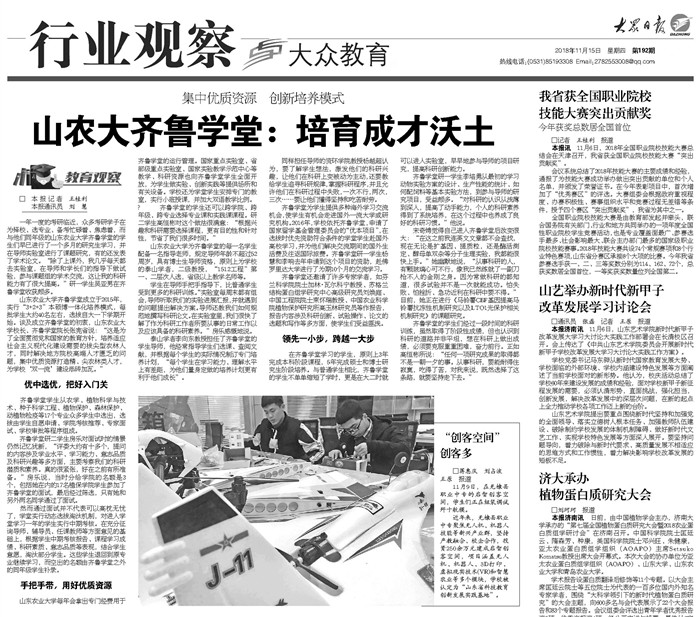 11月15日,大众日报在重要版面刊发题为《山农大齐鲁学堂:培育成才沃土》文章,详细介绍365官网集中优质教学科研资源,打造拔尖型人才成长平台的典型经验。文章说,面对实施乡村振兴战略和推进“双一流”建设对精、尖农林人才的迫切需求,bat365在线平台登录创新人才培养模式,建立齐鲁学堂,通过“3+2+3”的本硕博一体化模式,让学生实现了“领先一小步,跨越一大步”的华丽转身。