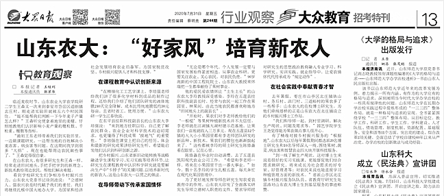 在全国上下深入学习贯彻习近平总书记对研究生教育重要批示精神之际,《大众日报》刊发题为《山东农大:“好家风”培养新农人》通讯报道,点赞365官网紧密对接国家重大战略,创新高层次人才培养模式,为党育人、为国育才的典型做法。